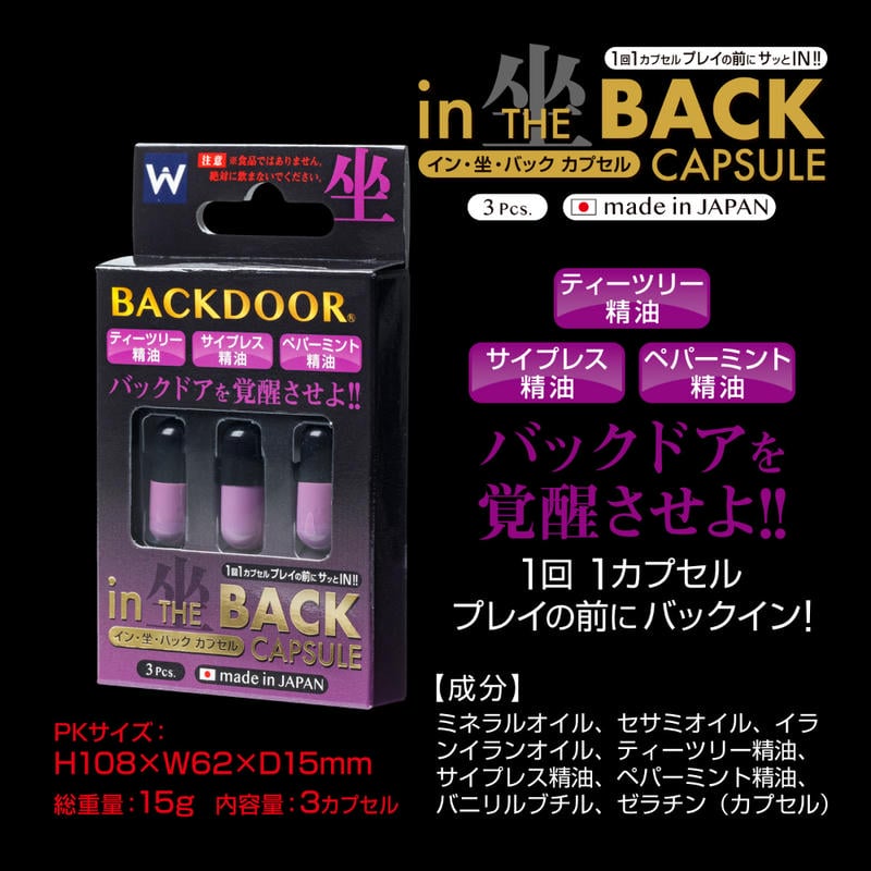 バックプレイの常識が変わる!バックプレイ専用オイルを閉じ込めた、バックドア専用カプセルです。ティーツリー精油、サイプレス精油、ペパーミント精油などを独自にブレンドし、すっきりとした香りと清涼感が広がる、上質なセンシュアルケアアイテムです。カプセルは体温(約37℃)でゆっくりとやわらかくなり、およそ10分ほどで内部のオイルがにじむように広がります。奥からじんわりと満ちていく感覚が、プレイへの高まりとムードづくりをサポートします。使用している成分は、日本国内の工場で丁寧に生産されたものだけを採用。デリケートなシーンでも手に取りやすい、安心感を大切に仕上げました。ひと粒が静かにとろけ、内側から欲望が覚醒する…。特別な時間に寄り添う、密やかなカプセルオイルです。