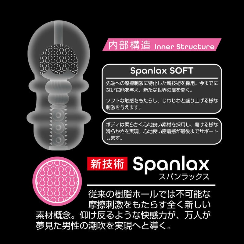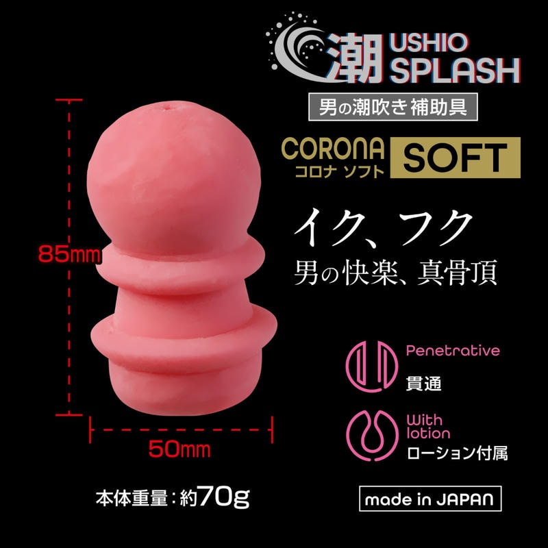全方位フェチをうたう男性向けブランド「360°FETISH」。今度の商品は未だかつてない「男の潮吹き」に特化した専用モデルです。潮(うしお)SPLASHは新技術Spanlax(スパンラックス)を開発・採用し、従来の樹脂型ホールでは不可能だった摩擦刺激をもたらします。今までのホールにはない素材感で、男の潮吹きをサポートします。CORONASOFTは優しい刺激をじっくり味わうことができる滑らかな使用感です。先端部分を上下にスライドするように使用することで、縊れ部分をくまなく刺激します。徐々に昂まる刺激と相まって、「男の潮吹き」への期待感が持てるアイテムになっています。また本品は匂いの少ない素材を使用した純国産です。このホールのために考えられた新素材・KRスキンを採用し、純度の高い快感を提供することが可能になりました。イクを超えて、噴け!!新たな可能性を探求してください。
