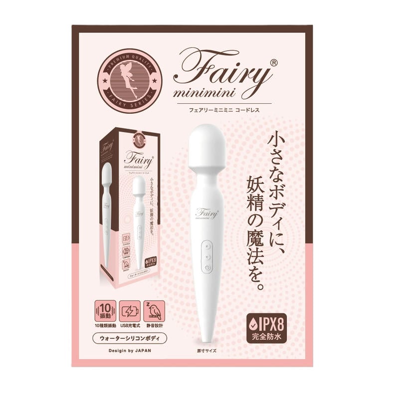あのFairyminiminiが、コードレスになって登場!!まるでそれは愛らしい妖精、コンパクトで小さいデンマ「フェアリーミニミニ」。全長19センチのスマートサイズに、なめらかなウォーターシリコンスキンをまとったボディ、美しいオフホワイトで統一されたカラーは、妖精(フェアリー)がもつ神秘的な魅力を再現しました。魅せられるようなリラクゼーションで、愛して癒やしてくれることでしょう。もちろん機能も充実。快感を惹きつける強力なハイパワーに、刺激のある振動アクション10パターン、周りが気にならない静音タイプ、ハイグレードな肌触りのウォーターシリコン素材、タフでサスティナブルなUSBバッテリー。防水レベル「完全防水IPX8」。取りまわしやすいヘッド直径33ミリ。小さな妖精でもその輝きは本物、妖精の魔法を楽しみましょう。