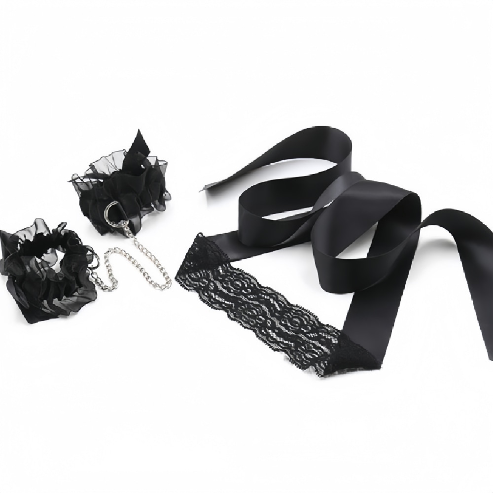 ☆目隠し&プチ拘束で禁断の快感が楽しめちゃう!☆シックな黒でまとめたアダルトなランジェリーコス!☆大人の魅力をかもし出す総レースデザイン!文句なしの勝負アイテム!!アブノーマルHデビューならコレっきゃない!繊細な黒レースが肌を優しく包み込み、誘惑フェロモンをかもし出すランジェリーコスチューム、ここに誕生!目隠しリボンで視界を奪われたまま身を委ねるドキドキ感と、手首のチェーン付きアクセで楽しむプチ緊縛プレイの刺激。どちらも普通のプレイでは物足りないアナタにとって、夜のアクセントになること間違いなし!さらに、ブラもショーツもラグジュアリーな総レースだから、シックな大人の魅力も演出できちゃう!ちょっぴり勇気を出して、未知の悦びに今、目覚める時。勝負の夜には、このランジェリーコスでスタンバイ!
