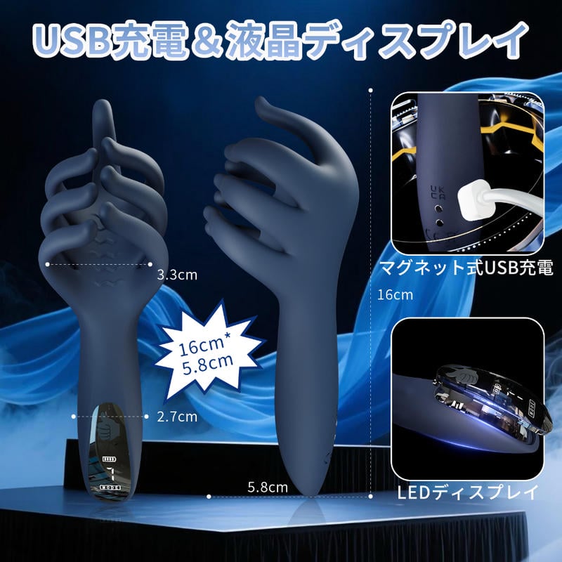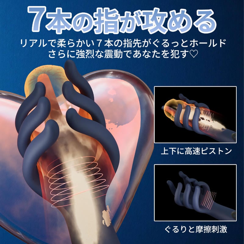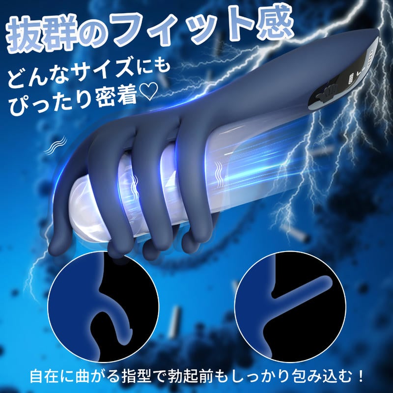独特な7本指デザインで、6本の指がペ●スを包み込み、上部の1本が亀●をしっかり刺激。7本すべてが同時に振動しながら密着し、波状のしわを施した手のひら部分が摩擦による快感を高めます。9種の振動モードと強力モーターを搭載し、操作はワンタッチで簡単。柔軟なシリコン素材で、指部分は自在に曲がりフィット。LEDディスプレイ、マグネット式USB充電、防水等級IPX5対応。