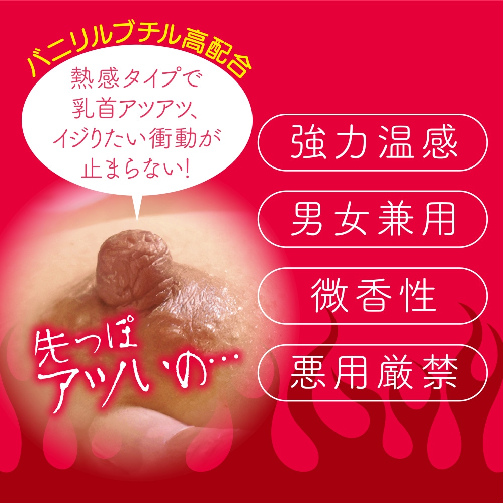 《熱感マグマで、乳首キマる。》大好評の【キメチク】シリーズにバニリルブチル配合の強力温感タイプが加わりました!性感開発、チクニー、チクパコetc.アナタのチク活をこれ1つでHOTにサポート!適量を手にとり乳首に塗り込むだけ!塗り込むほど乳首アツアツ、イジりたい衝動が止まらない!男性と女性どちらの乳首にも塗って使えるユニセックス仕様です!【悪用厳禁】パートナーにお使いの際は事前に同意を得てください。※乳首に最適化しておりますが、局部に塗ってもお楽しみいただけます。