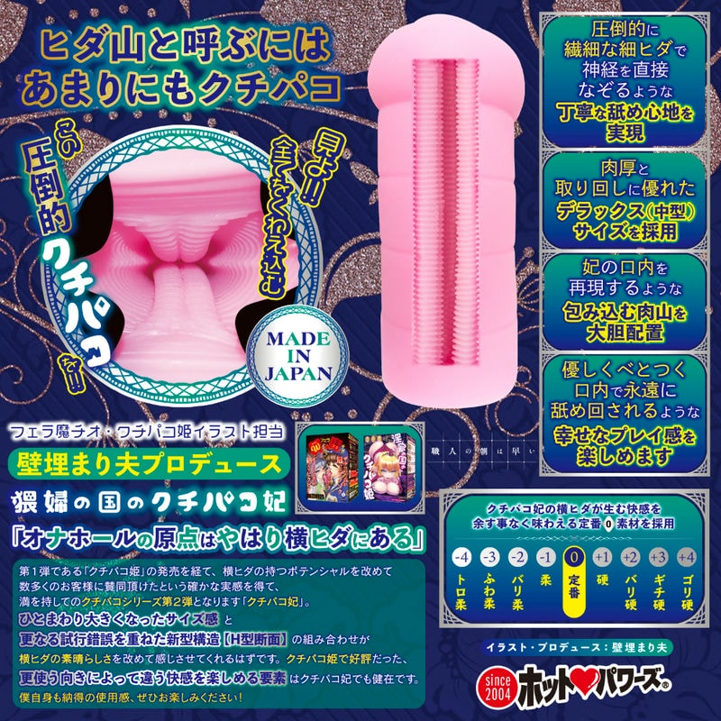 今度のクチパコはお妃様だッ!コイツっ清楚そうなクセに…とんだクチパコしてやがるっ!!【クチパコとは?】口内にある無数の横ヒダが絡みつき、セックスよりも数段気持ち良い快感を与える極めて稀有な種族の名称。妃は姫以上に力強く擦り上げる絶品の横ヒダを持つ。「オナホールの原点はやはり横ヒダにある」第1弾である「クチパコ姫」の発売を経て、横ヒダの持つポテンシャルを改めて数多くのお客様に賛同頂けたという確かな実感を得て、満を持してのクチパコシリーズ第2弾となります「クチパコ妃」。