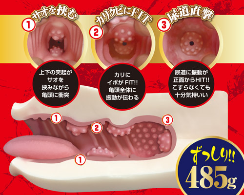 入り口の唇による密着感と、内部に設けられた「ベロ(舌)」パーツによる絡みつき。