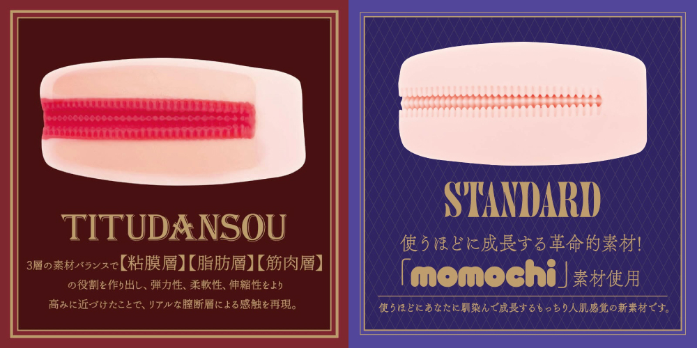 THE MEISTER CLASSICシリーズ第2弾「STANDARD」は「TITUDANSOU」よりもっと強い刺激がほしいとの要望を元に、同形状ながら、素材と構造を変更した刺激特化モデル。momochiスタンダード素材を採用したことにより、ゾリゾリとした感触がダイレクトに伝わる仕様になりました。「膣断層」では刺激が物足りなかった方や、人体に近い体感より「手応え」を求める方に最適なオナホールです。